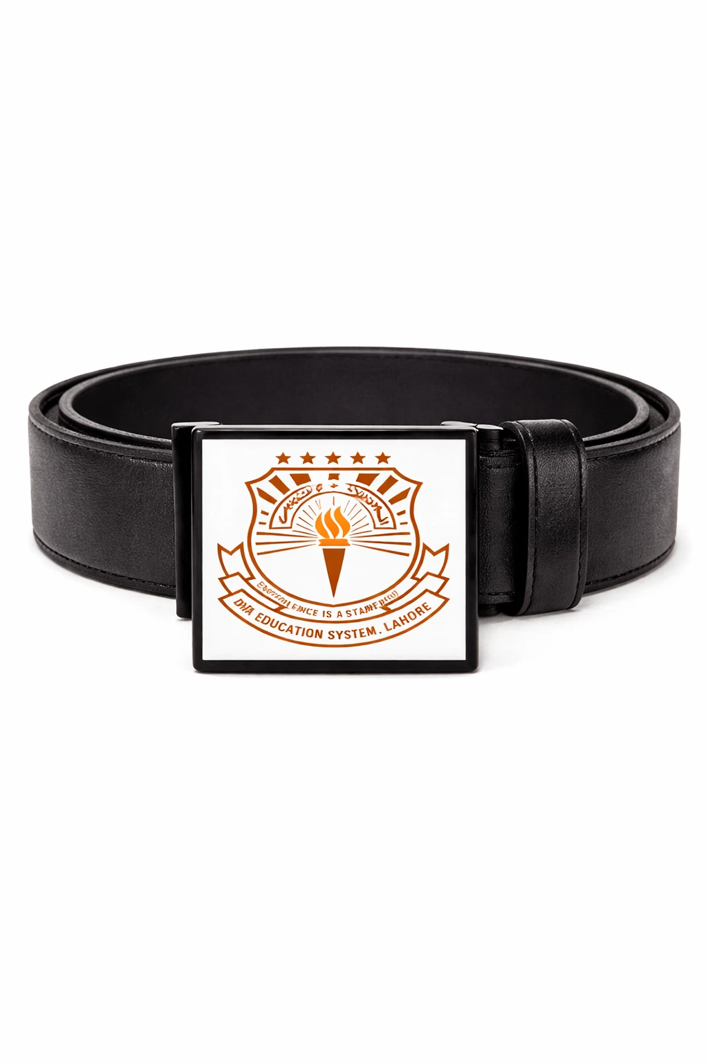 DESIGN: Square DHA Education System logo buckle.